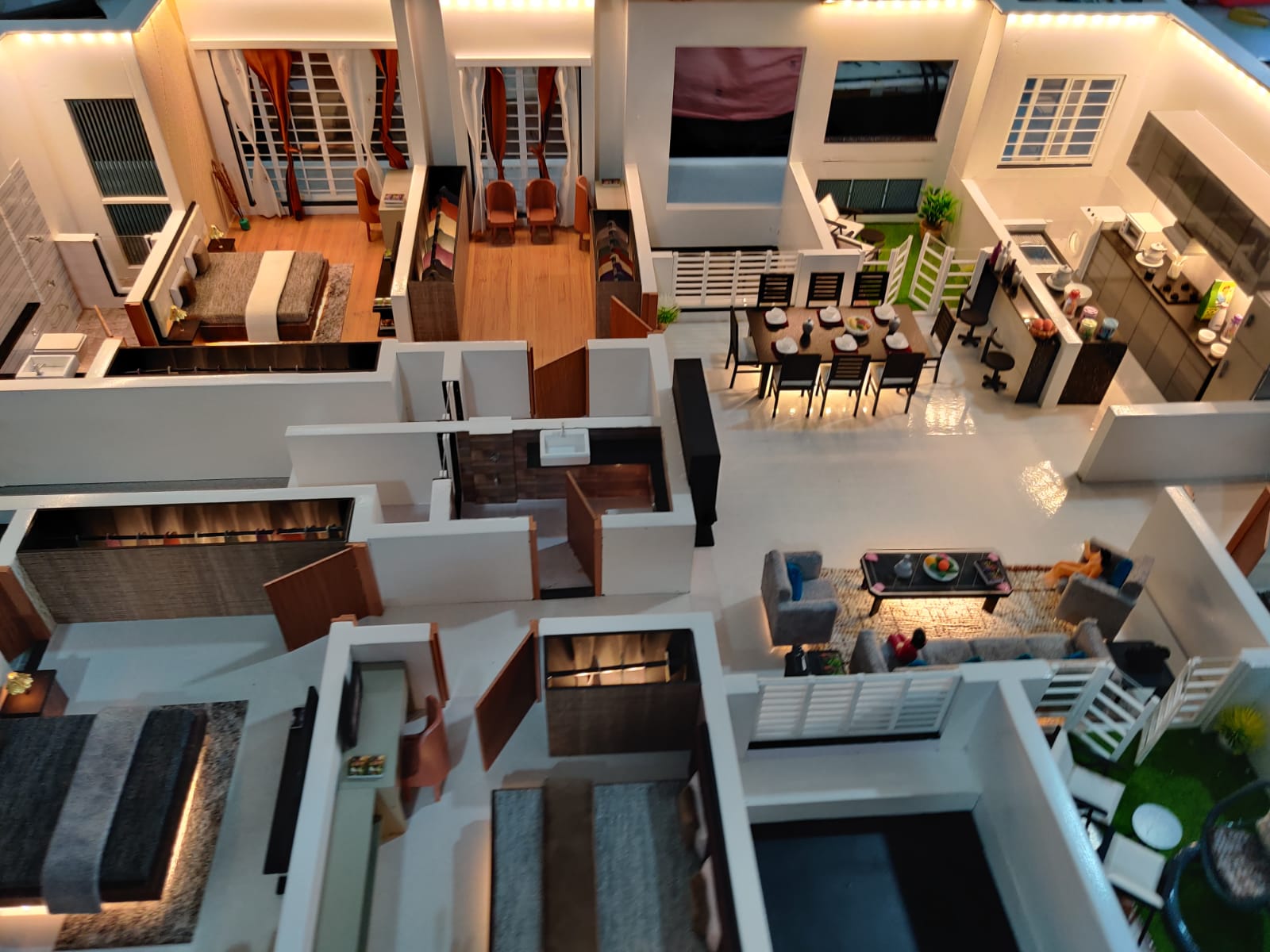 At Bhagirath Architectural Models, we create 2 BHK flat models with high precision, highlighting every detail—from contemporary bedrooms and modular kitchens to open dining areas and living spaces. The model in the image showcases realistic furniture, modern interiors, and aesthetic lighting effects for a life-like representation. Each model is built using premium materials for durability and a premium finish.